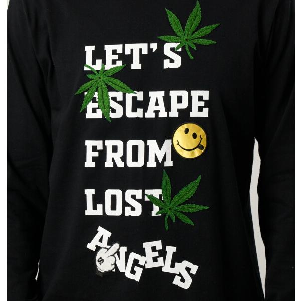 -LET"S ESCAPE FROM LOST-ロゴプリントにパフスマイルやWEEDサガラワッペンを贅沢にパッチワークしたラフト感あるデザインに仕上げている。