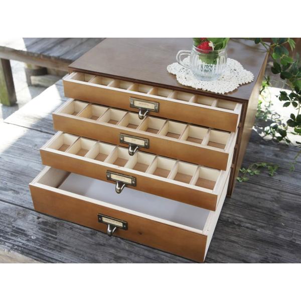 木製のメディスンボックスです。アンティーク風なデザインがお洒落。引出しは4つ。上3段は同じで一番下の引き出しのみ深さがあります。上3段は取り外し、組み換え可能な仕切り付きです。薬だけではなく、デコパーツやアクセサリー、ハンドメイド用品など 細々としたものの整理にお役立ちです。無地のシールが付属してますので、薬なら飲み忘れのないようにチェックできます。お使いの用途に合わせてご活用ください。一番下の引き出しは仕切りなしです。各引き出しはA4サイズの用紙がぴったり収まるサイズ。救急箱として使う場合は体温計や絆創膏などを入れて・・。アンティーク調の取っ手には「MORNING」「EVENING」「DAY」「MEDICINE BOX」とプリントされた 紙が入っています。仕切り枠をはずして書類ケースとして、小物入れとして・・ マルチに使える引き出しです。サイズは外寸:幅34.4cm、奥行28.4cm、高さ22cm内寸:上1〜3段 幅30.7cm、奥行27.0cm、深さ2.7cm4段目 幅30.7cm、奥行27.0cm、深さ5.7cm"}