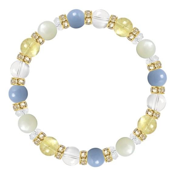 こちらはシトリンとエンジェライトを組み合わせた天然石ブレスレット。クリスタル・マザーオブパールをベースにした女性らしいデザイン。8mmストーンなので天然石が初めての方にもおススメのサイズ感です。