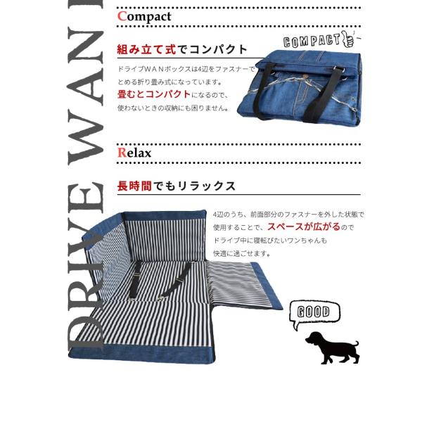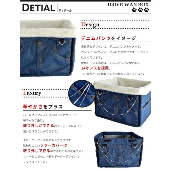 ライブ中愛犬がウロウロして困ったことはありませんか?そんなときは、RURUPET 2way ドライブWANボックスオシャレで機能的なドライブボックスです。デニムパンツをイメージしたデザインで、本物のデニムパンツに多い14オンス生地が採用されていますので、厚みがあり高級感たっぷりです☆"}