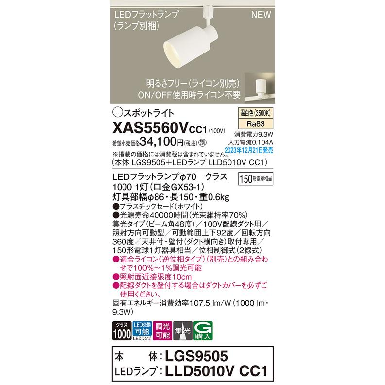 【法人様限定】パナソニック XAS5560V CC1 LEDスポットライト 配線ダクト取付型 ビーム角48度 集光 調光 温白色【LGS9505 + LLD5010V CC1】