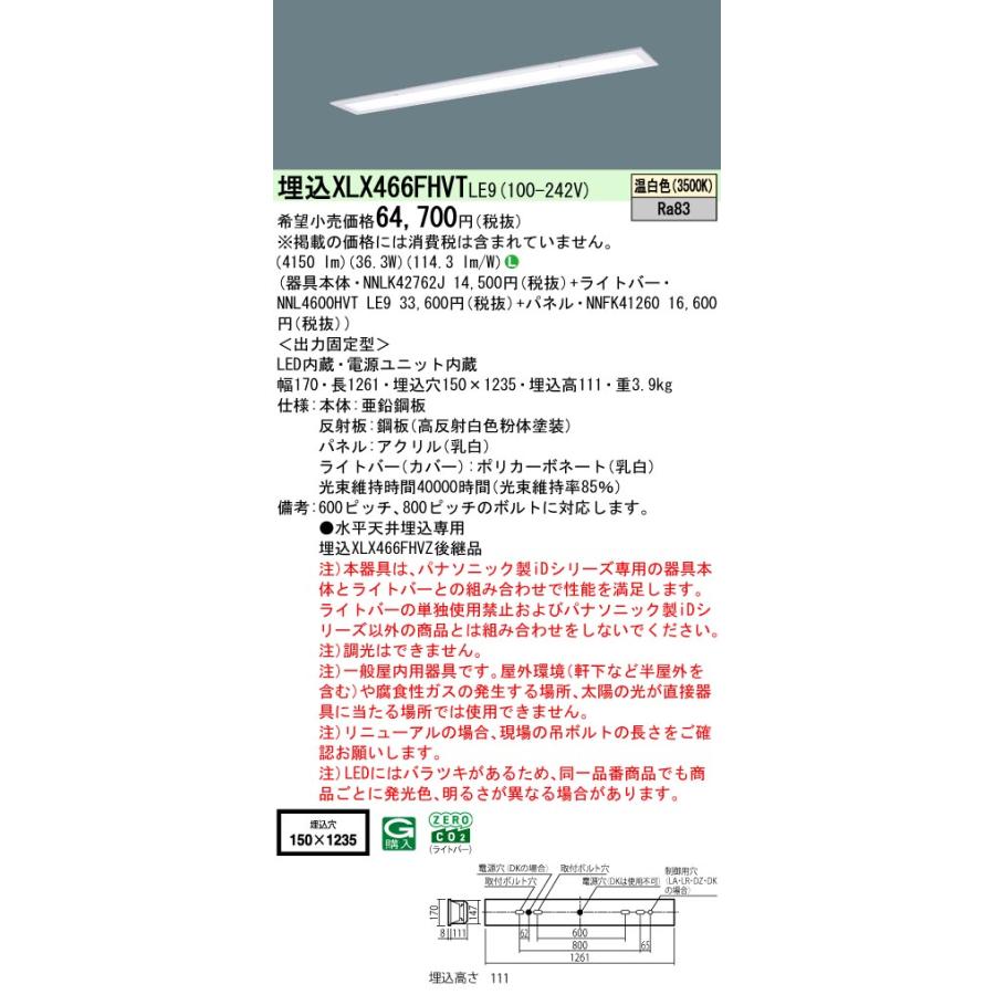 天井埋込型 40形 一体型LEDベースライト 乳白パネル パネル付型/フリーコンフォート Hf蛍光灯32形高出力型2灯器具相当 Hf32形高出力型・6900 lm【器具本体】NNLK42762J 【ライトバー】NNL4600HVT LE9 【プラスユニット】NNFK41260LED内蔵、電源ユニット内蔵※XLX466FHVZ LE9(XLX466FHVZLE9)の後継品光源◆LED(温白色) ◆色温度:3500 K ◆光源寿命40000時間(光束維持率85%)寸法・質量◆幅:170 mm ◆長:1261 mm ◆埋込穴幅:150 mm ◆埋込穴長:1235 mm ◆埋込高:111 mm ◆質量:3.9 kg仕様・注意事項◆器具光束:4150 lm ◆安定器出力型:定格出力型 ◆安定器補足:<出力固定型> ◆電圧:100〜242 V ◆消費電力:36.3 W ◆消費効率:114.3 lm/W◆【本体】亜鉛鋼板◆【反射板】鋼板(高反射白色粉体塗装)◆【パネル】アクリル(乳白)◆【ライトバー(カバー)】ポリカーボネート(乳白)◆天井埋込型◆Ra83◆600ピッチ、800ピッチのボルトに対応します。◆●水平天井埋込専用◆注)調光はできません。