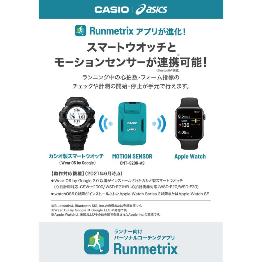 【カシオ CASIO × アシックス ASICS モーションセンサー Runmetrix CMT-S20R-AS カシオとアシックスの共同開発により、新たなランナー向けサービス「Runmetrix」が誕生します。カシオのセンシング技術、ウェアラブル技術と、アシックスのスポーツ工学に関する知見、ノウハウ、ビッグデータの融合により、ランナーひとりひとりに最適な情報を提供。モーションセンサーは、GPS機能+9軸センサーを搭載し、スマートフォンなしでランニング中の身体の動きを細かく計測可能。ウェアに装着して走ることで、ピッチ、ストライドはもちろん、上下動や左右の傾きなど、20種類以上のランニング指標を測定できます。また、専用のスマートフォンアプリ「Runmetrix」を新たに開発。モーションセンサーの計測データをアプリで確認できるほか、ランニングフォームやペースの分析、トレーニングプランやからだづくりのアドバイスまで、パーソナルコーチとして日々の運動をアシストします。自分らしく走る喜びをすべての人に。新たなランニング体験が、いま始まります。「カシオ Gショック CASIO G-SHOCK 2021 新作」「国内正規品」】