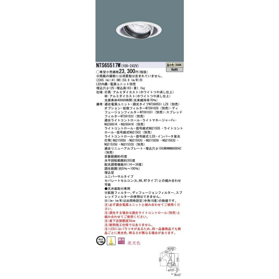 βパナソニック 照明器具【NTS65517W】天井埋込型 LED(温白色) ユニバーサルダウンライト 調光タイプ(ライコン別売) LED 550形{V}